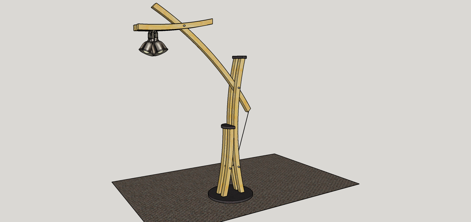 Uit vuren vervaardigde leeslamp met gebogen elementen.